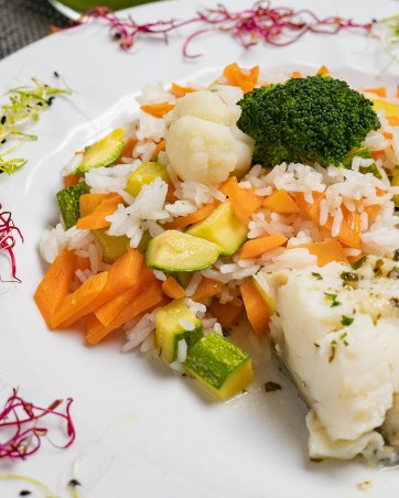 Pasto TRILFIT. I nostri chef hanno rivisitato la classica ricetta del merluzzo alla mugnaia per renderlo bilanciato e salutare. Le verdure biologiche con il riso jasmine dal sapore deciso, accompagnano sapientemente il merluzzo del Mediterraneo nella nostra versione "alla mugnaia".