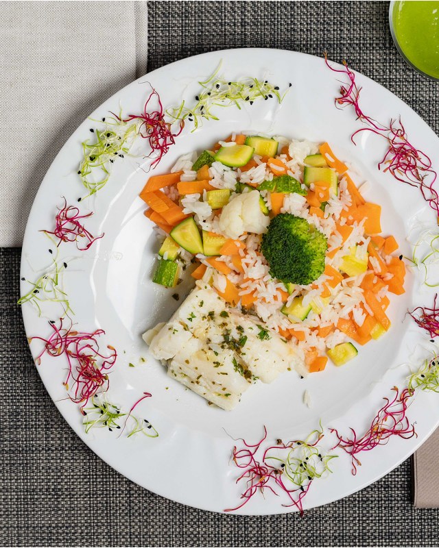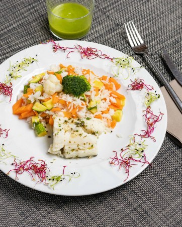 Merluzzo (90g), prezzemolo (5g), limone (20g), riso jasmine (80g), sedano (45g), carote (45g), zucchine (45g), sale (10g), olio (20g)