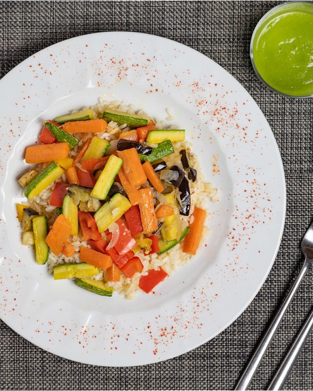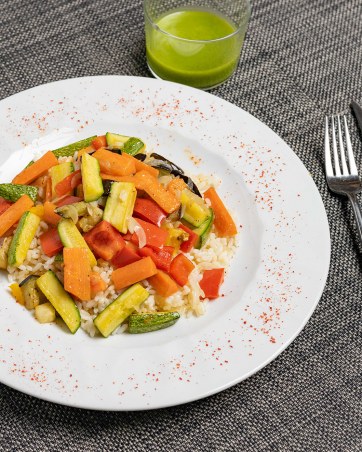 Riso carnaroli integrale (34g), melanzane (35g), peperoni (35g), cipolla (35g), sedano rapa (35g), sedano (35g), carote (35g), zucchine (35g), pepe (5g), sale (10g), olio (20g)