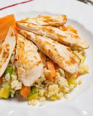 Petto di pollo (100g), riso carnaroli integrale (30g), sedano rapa (40g), sedano (40g), carote (40g), zucchine (40g), sale (8g), olio (20g)