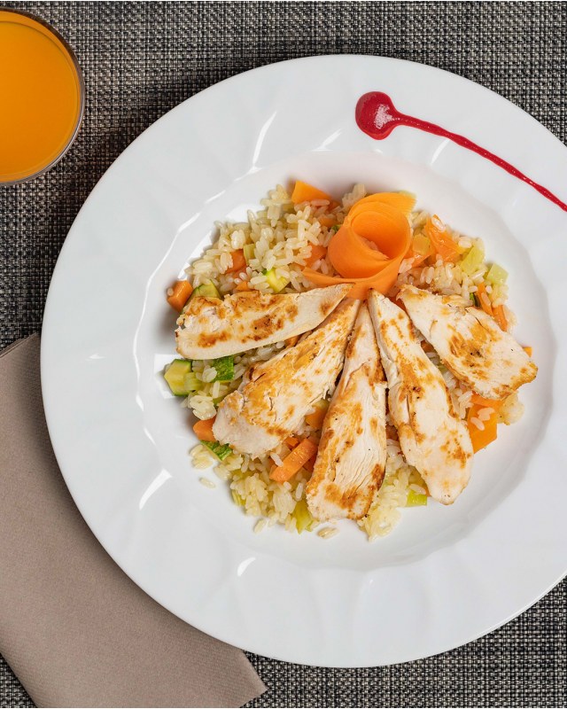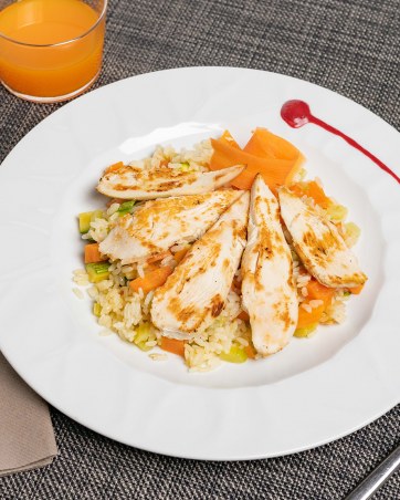 Pasto TRILFIT: il classico piatto perfettamente bilanciato di proteine carboidrati e verdure. La tagliata di pollo cotta a bassa temperatura succosa e saporita si abbina sapientemente alla ruvidità del riso integrale e alla croccantezza delle verdurine gustose e leggere.