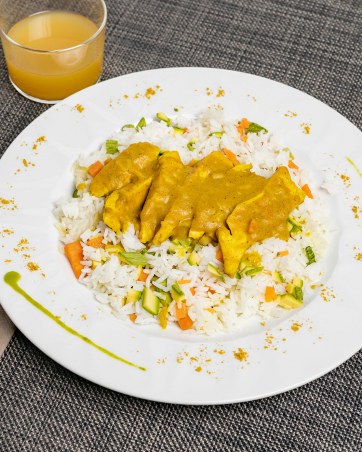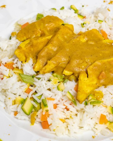 Riso jasmine (50g), petto di pollo (80g), curry (10g), sedano (60g), carote (60g), zucchine (60g), sale (7g), olio (20g)