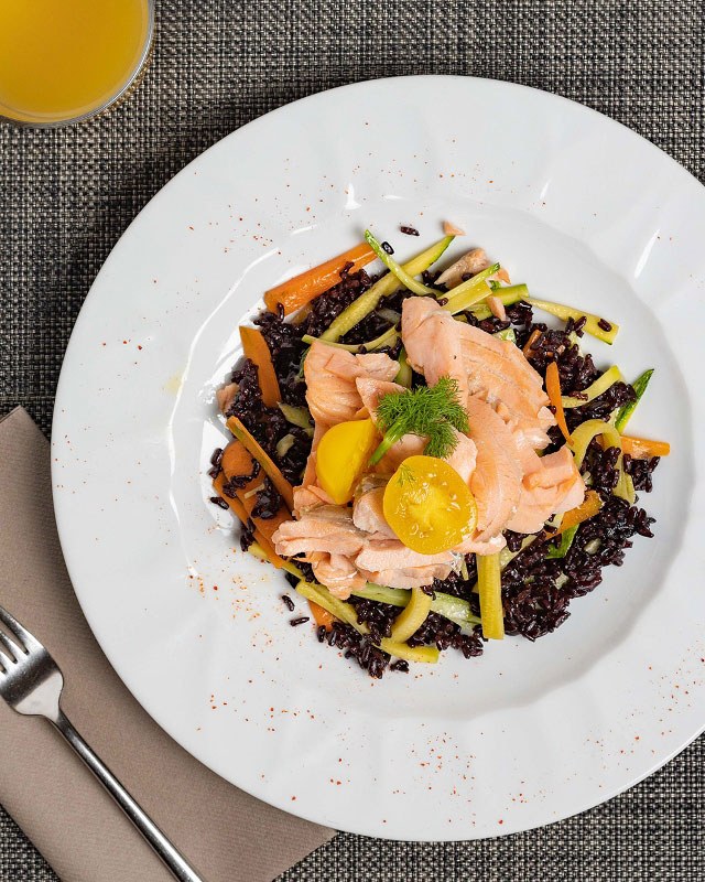 Riso carnaroli integrale (40g), salmone (90g), bieta (90g), pepe (3g), sale (10g), olio (20g)